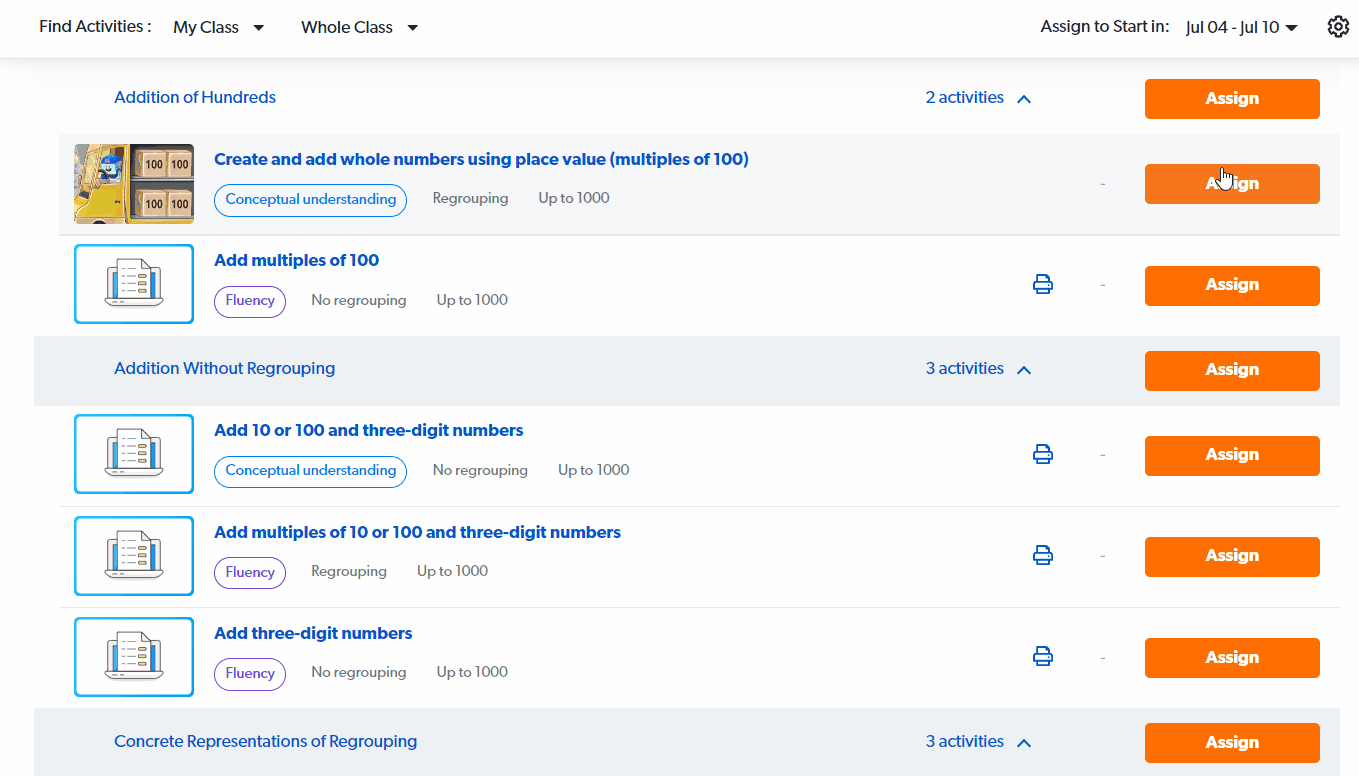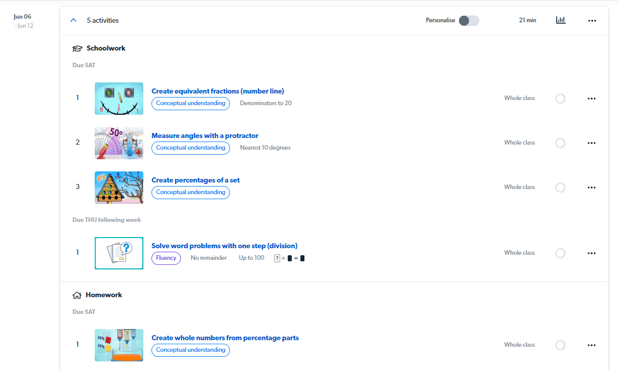 Selecteer de week waarvoor je taken toe wil wijzen en Matific zorgt voor de rest