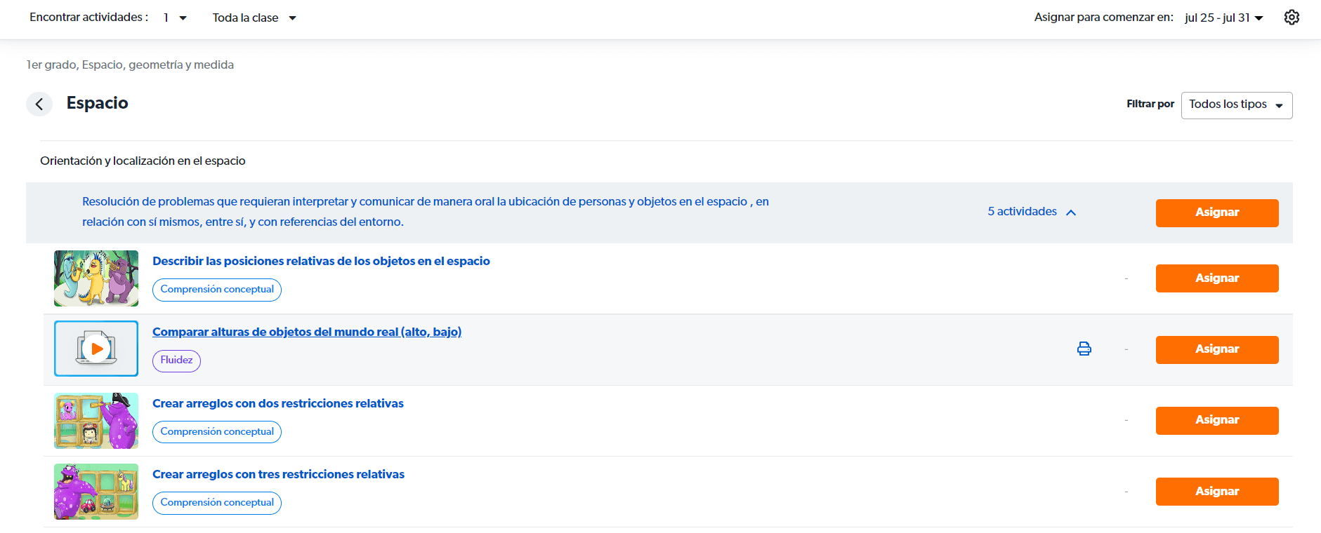 Si quiere asignar con algunas semanas de anticipación, comience por clickear ''Asignar'' en las actividades que desea que los estudiantes comiencen esta semana. Luego, cambie la semana actual por la siguiente utilizando el menú que se encuentra arriba, a la derecha, y luego clickee en ''Asignar'' en las actividades que desea para la próxima semana. ¡Cambie la semana y siga asignando para planificar su trimestre!