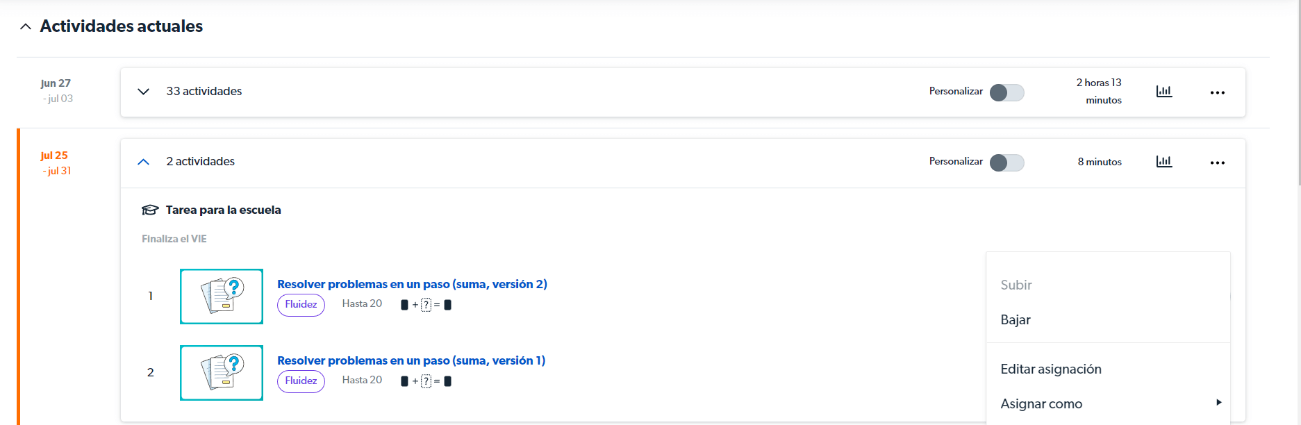 Al abrir una semana le permitirá ver todas las actividades asignadas para esa semana, con más opciones para personalizar el orden en el que sus estudiantes verán las actividades, y editar las fechas de una actividad individual: